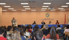 Numerosos asistentes se dieron cita en el salón de actos para no perderse detalle de este coloquio. Entre ellos, el Rector, vicerrectores, decanos, profesores y estudiantes.