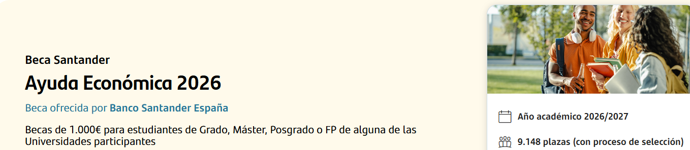 124 becas de 1.000€ para hacer de tus estudios aún más grandes. Si eres estudiante de FP Superior, Grado, Máster o Posgrado para el curso académico 2026/2027 podrás optar a ellas; consulta las bases de la Convocatoria.