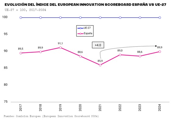 En 2024, por tercer año consecutivo, España recorta distancias con la media de la UE-27 en innovación, alcanzando un 89,9% (fue el 88,6% en 2023). La distancia mínima, no obstante, se produjo en tiempos prepandémicos, en 2019, cuando se llegó al 91,1% de la media.